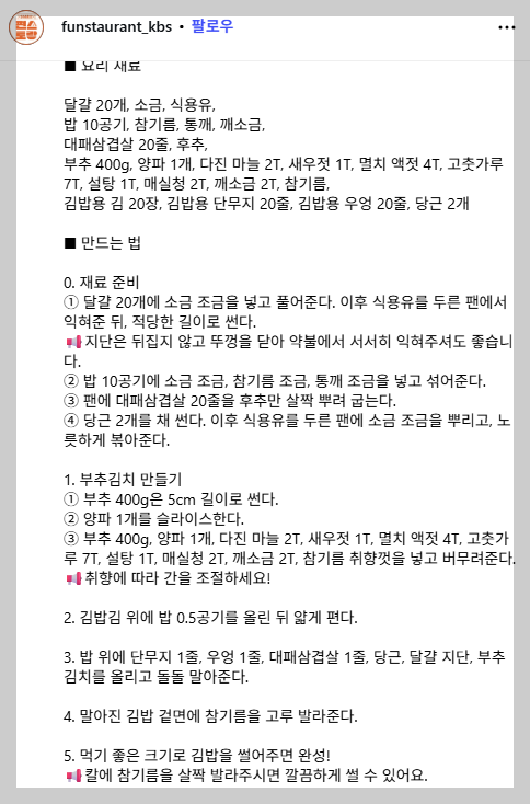 편스토랑 찬또셰프 이찬원의 공식 레시피, 부추삼겹김밥 만들기! 부추김치와 삼겹살, 달걀지단이 어우러진 영양만점 김밥 레시피를 집에서 따라해보세요.