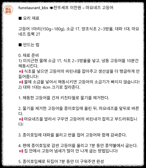 오늘은 찬또셰프 이찬원이 [편스토랑]에서 공개한 특별한 레시피, 마요네즈 고등어를 소개합니다.