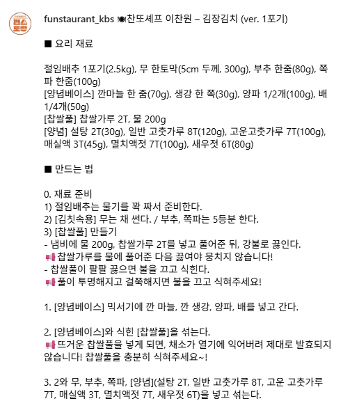 오늘은 편스토랑 찬또셰프 이찬원 표 김장김치 레시피를 소개합니다.