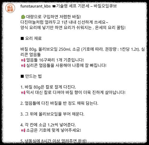 📢 바질오일큐브 레시피는 아래 참고 👇 - 🧄 마늘 10쪽 (편으로 썰기)