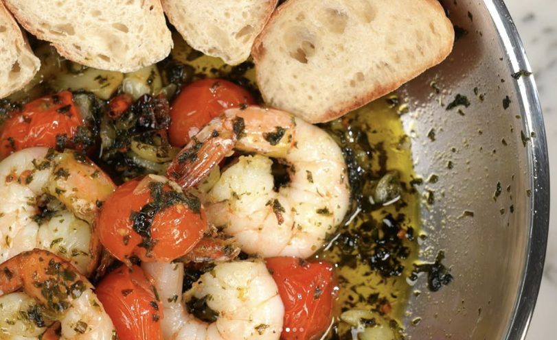 - 바게트를 곁들여 접시에 담으면 집에서 즐기는 바질오일감바스 완성! 🥰