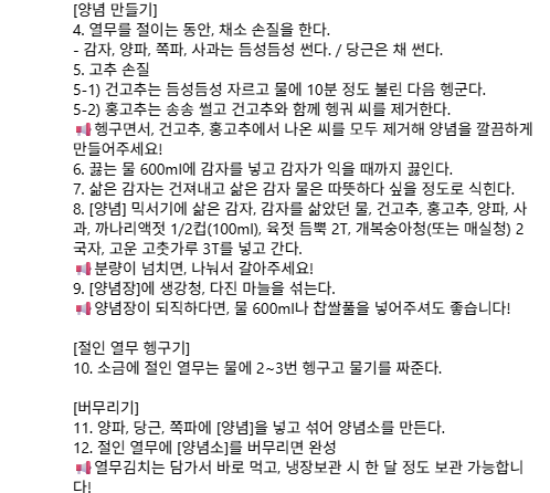 - 양념: 말린고추 28~30개, 홍고추 5개, 다진 마늘 5T, 생강청 2.5T, 까나리액젓 1/2컵(100ml), 육젓 2T, 개복숭아청(또는 매실청) 2국자(5T), 고운 고춧가루 3T