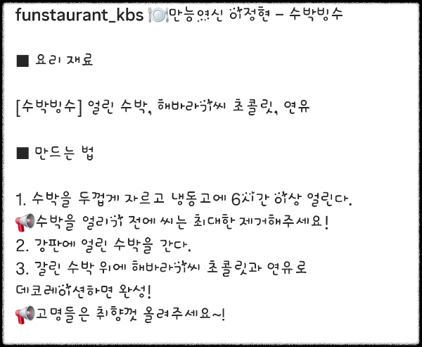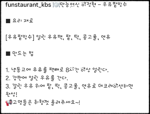여름엔 시원한 빙수만 한 간식이 없습니다. 이번에 소개할 레시피는 **KBS2 ‘편스토랑’**에서 만능여신으로 불리는 이정현 씨가 공개한 우유팥빙수와 수박빙수입니다.