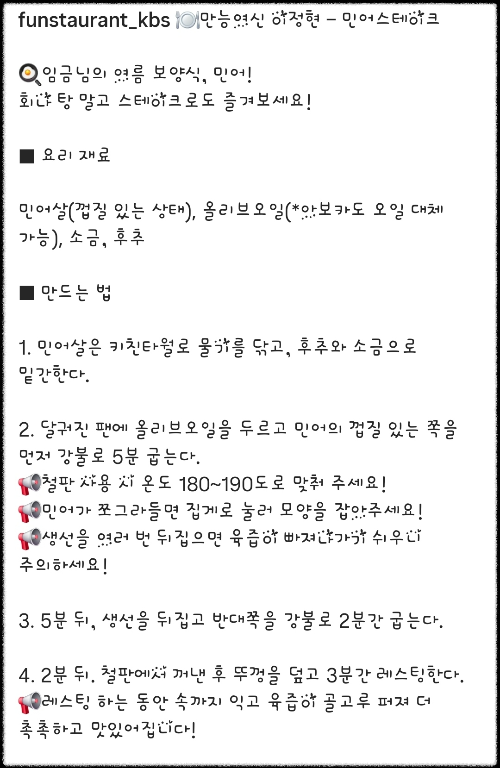 방송인 이정현 씨가 '편스토랑'에서 소개한 민어 스테이크 레시피를 재현해드립니다.