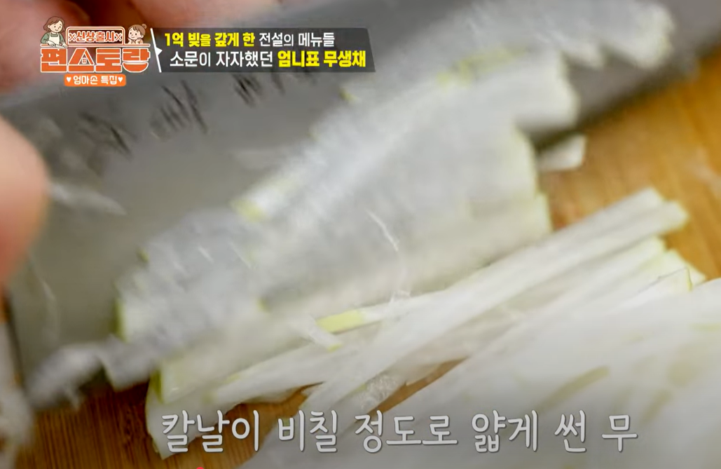 무생채의 맛은 썰기의 두께에서 시작됩니다. 엄마는 손으로 정말 얇게 채를 썰어 식감과 양념이 잘 배도록 합니다.