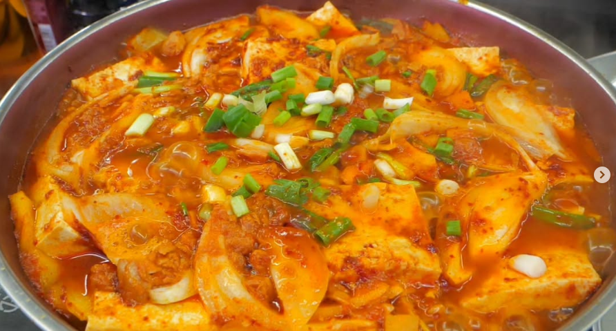 📢 팬 바닥에 깐 양파는 두부가 타지 않게, 위에 올린 양파는 식감을 살려주는 용도입니다.