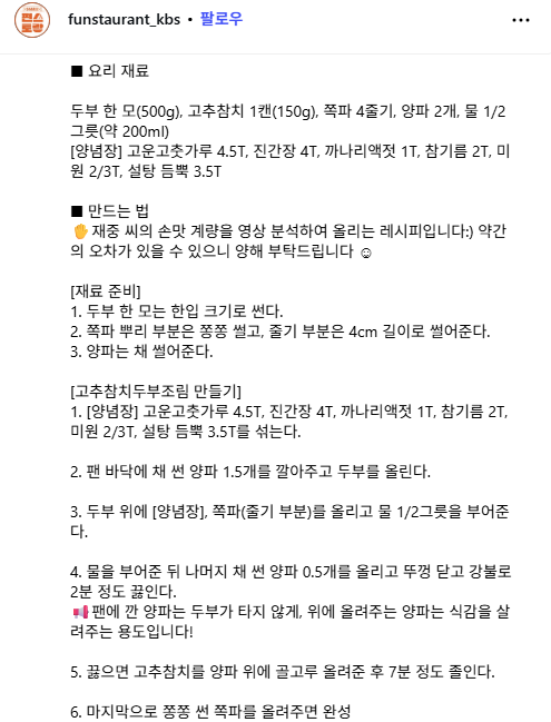 고추참치캔과 두부를 활용한 매콤칼칼한 집밥 레시피. 재중 씨의 손맛 계량을 분석하여 누구나 따라할 수 있게 정리했습니다.