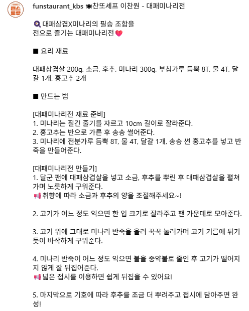대패삼겹살과 미나리로 바삭하고 고소하게 즐기는 이찬원표 대패미나리전 레시피. 집에서도 간편하게 만들 수 있는 전 요리 레시피를 소개합니다.