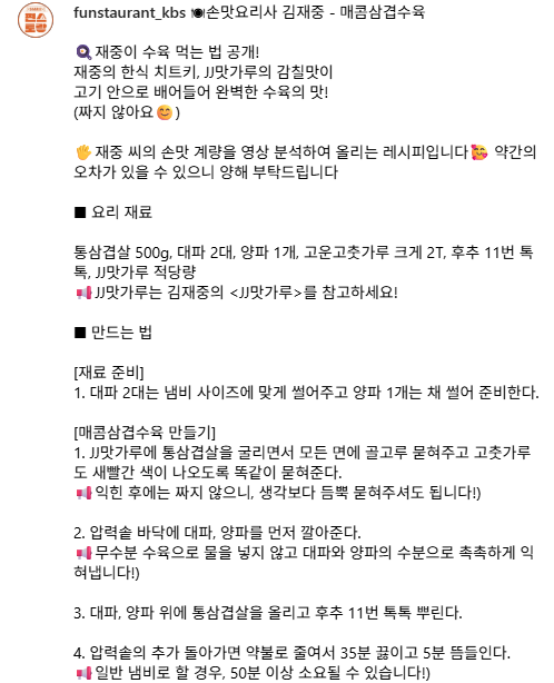 🖐 본 레시피는 김재중 씨의 방송 영상을 분석해 정리한 것으로, 약간의 오차가 있을 수 있습니다.