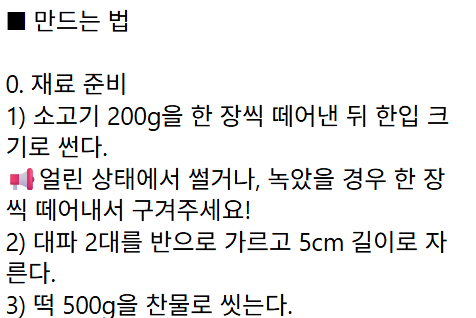 - 소고기는 한 장씩 떼어내어 한입 크기로 썬다.