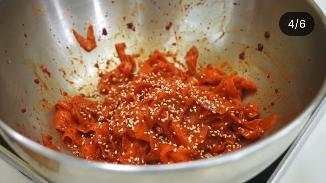 - 볼에 채 썬 쌈무 + 양조간장 1T + 고춧가루 2T 넣고 잘 무치기