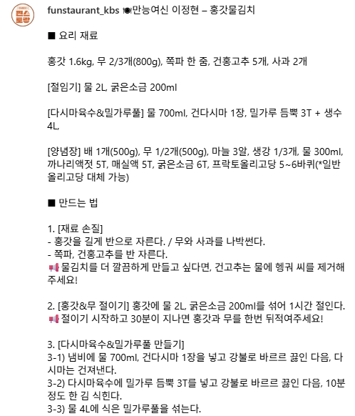 편스토랑 이정현표 홍갓물김치 레시피를 소개합니다. 새콤하고 시원한 국물 맛과 아삭한 홍갓의 식감이 어우러진 물김치로, 여름철 입맛 살리는 집밥 반찬으로 제격입니다.