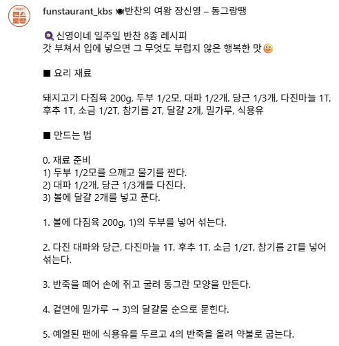 편스토랑 장신영이 소개한 동그랑땡 레시피! 돼지고기 다짐육과 두부, 채소를 넣어 부드럽고 촉촉하게 완성하는 집밥 반찬. 아이부터 어른까지 좋아하는 인기 메뉴를 쉽게 따라 해보세요.