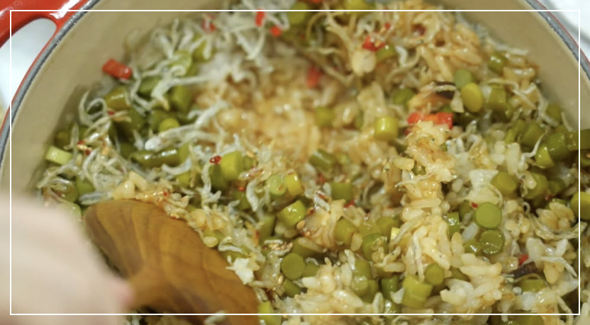 완성된 잔멸치솥밥은 고소한 양념장과 함께 비벼 먹으면 더욱 풍미가 살아납니다!