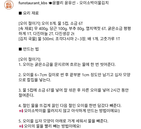 편스토랑 윤유선표 오이소박이물김치 레시피! 아삭한 오이를 절이는 비법부터 시원한 김치 국물 만들기까지, 집에서도 쉽게 따라 할 수 있는 오이소박이물김치 만드는 법을 소개합니다.