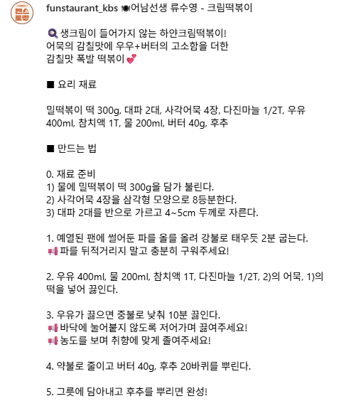 생크림 없이 만드는 류수영표 하얀 크림떡볶이 레시피! 파를 태우듯 굽고, 우유·버터·어묵으로 깊은 감칠맛을 낸 부드럽고 고소한 크림떡볶이를 확인하세요.