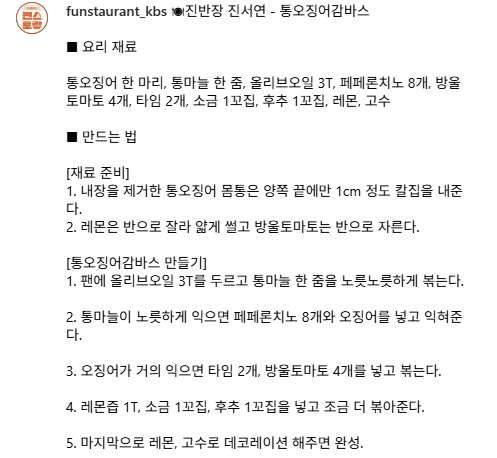 편스토랑 진서연이 선보인 통오징어감바스 레시피! 통오징어, 마늘, 페페론치노가 어우러져 집에서도 스페인 감바스의 풍미를 즐길 수 있습니다.