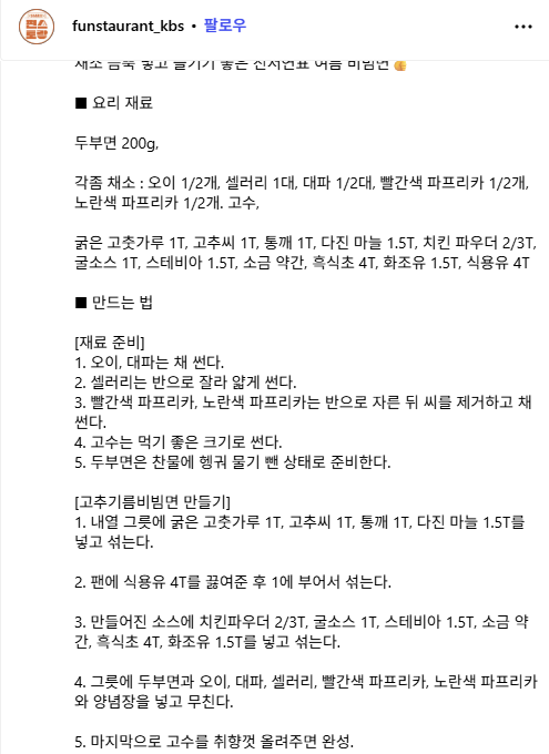 채소와 두부면으로 부담 없이 즐길 수 있는 편스토랑 진서연 고추기름비빔면!