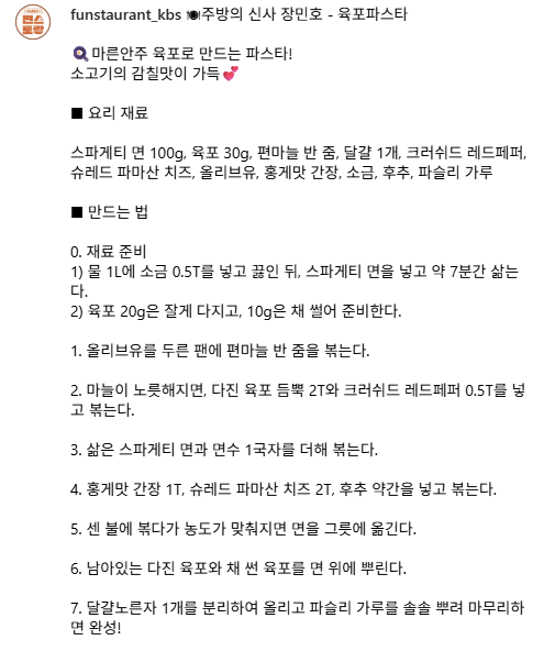 육포는 술안주로만 즐기기 아까운 재료예요. 감칠맛이 진해 파스타에 넣으면 색다른 풍미를 느낄 수 있습니다. 이번에 소개할 메뉴는 편스토랑 장민호의 육포파스타랍니다.