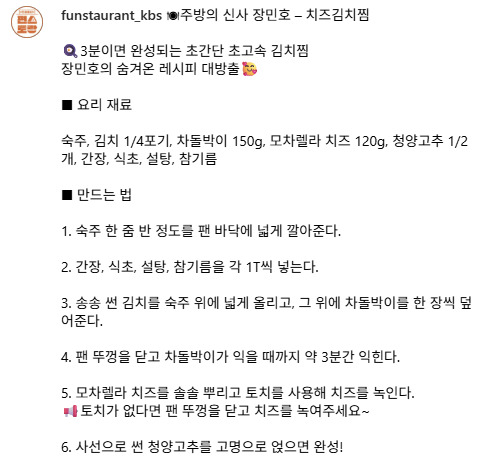 편스토랑 장민호의 초간단 ‘치즈김치찜’ 레시피 공개! 숙주와 김치, 차돌박이, 모차렐라 치즈가 어우러진 3분 완성 초고속 김치찜으로, 간단하면서도 풍미 가득한 한 끼를 즐겨보세요🍳