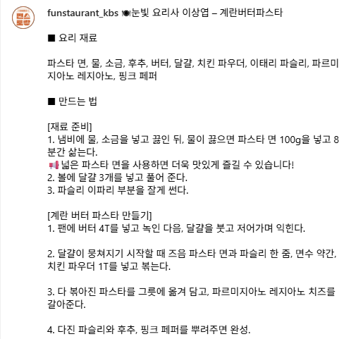 편스토랑 이상엽 셰프의 계란버터파스타 레시피를 집에서도 쉽게 만들 수 있도록 정리했습니다. 부드러운 달걀과 버터의 풍미, 파르미지아노 치즈의 고소함이 어우러진 파스타 레시피입니다.
