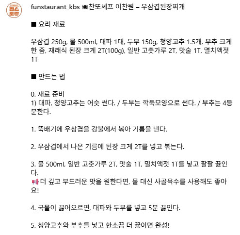 편스토랑 찬또셰프 이찬원의 우삼겹된장찌개 레시피를 소개합니다. 우삼겹의 고소한 풍미와 재래식 된장의 진한 맛이 어우러진 찌개로, 밥 한 그릇이 순식간에 비워지는 국민 밥도둑 메뉴입니다.