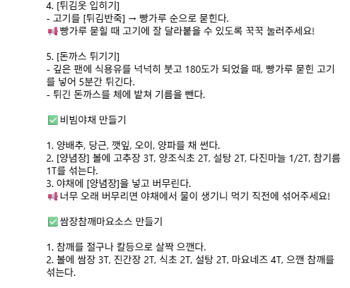 - 야채: 양배추 2장, 당근 1/3개, 깻잎 4장, 오이 1/3개, 양파 2/3개