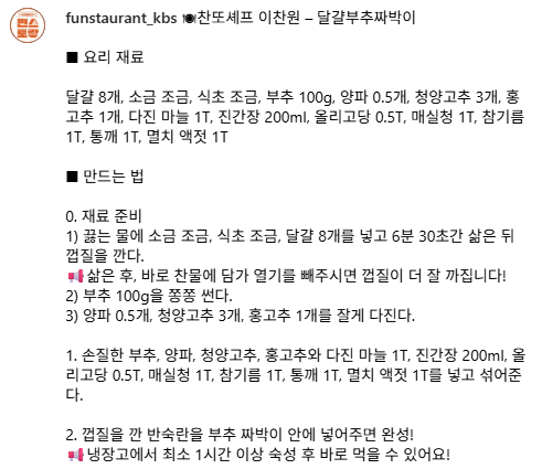 편스토랑 찬또셰프 이찬원이 소개한 달걀부추짜박이 레시피입니다. 반숙 달걀과 향긋한 부추, 짭조름한 간장 양념이 어우러져 밥반찬으로 딱 좋은 짜박이 반찬이에요. 숙성 후 바로 즐길 수 있는 간단하고 중독성 있는 맛을 확인해보세요.