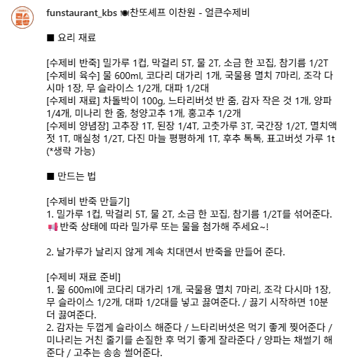 편스토랑 찬또셰프 이찬원이 소개한 얼큰수제비 레시피! 막걸리로 반죽해 쫄깃한 식감과 깊은 육수맛이 일품인 얼큰수제비 만드는 법을 단계별로 정리했습니다.