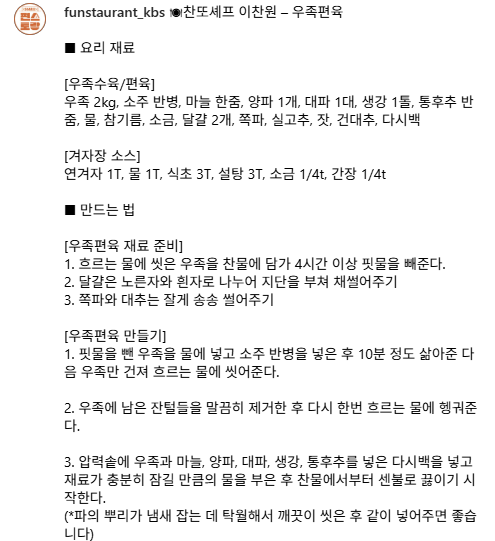 편스토랑 찬또셰프 이찬원이 공개한 ‘우족편육’ 레시피입니다. 쫀득하고 고소한 우족살을 부드럽게 삶아 만든 겨울철 별미! 집에서도 간단히 따라 할 수 있는 우족편육 만드는 법과 겨자장 소스 비율을 함께 소개합니다.