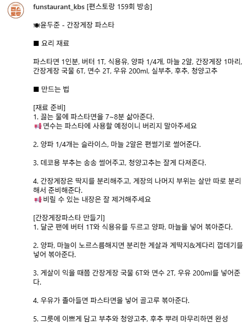 편스토랑 159회 윤두준이 선보인 간장게장 파스타 레시피를 소개합니다. 고소한 버터와 짭조름한 간장게장이 만나 깊은 감칠맛을 내는 특별한 파스타! 간단한 재료로 집에서도 손쉽게 만들어보세요.