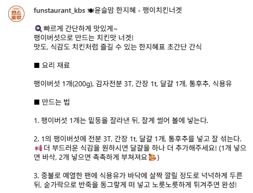 팽이버섯으로 만드는 초간단 치킨너겟! 한지혜표 팽이치킨너겟은 빠르고 간단하면서도 바삭하고 촉촉한 식감이 일품입니다. 편스토랑 공식 레시피로 건강한 간식 만들어보세요🍗