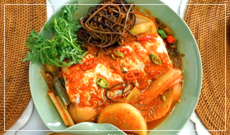 📢다시마로 갈치 덮으면 감칠맛 상승, 비린내 제거 - 다시마 제거 후 청·홍고추, 쑥갓 올리고 뚜껑 덮고 13~15분 졸이기
