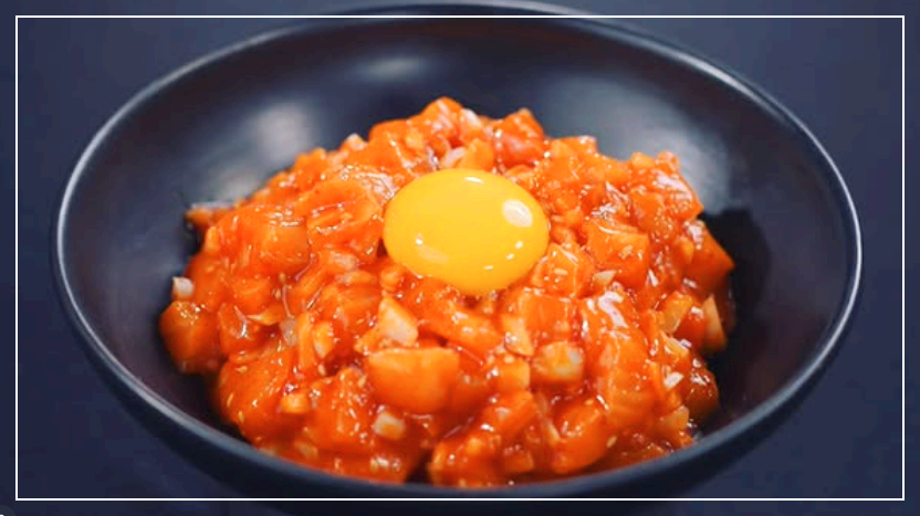 📢 완성된 연어육회는 달걀노른자를 곁들여 김에 싸 먹으면 더욱 맛있습니다!