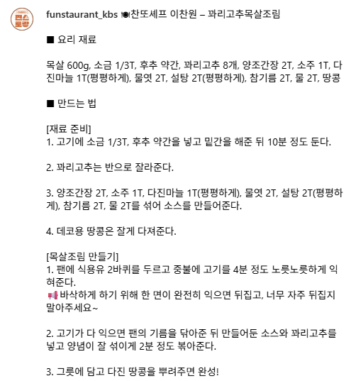 이찬원 편스토랑 꽈리고추목살조림 레시피입니다. 밥도둑 목살조림 소스 비율부터 꽈리고추의 알싸한 풍미까지, 간단하지만 깊은 맛의 집밥 메뉴로 소개합니다.