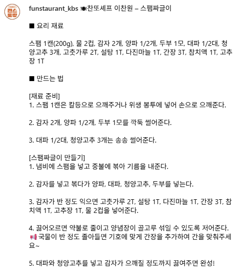🍳 찬또셰프 이찬원 – 스팸짜글이