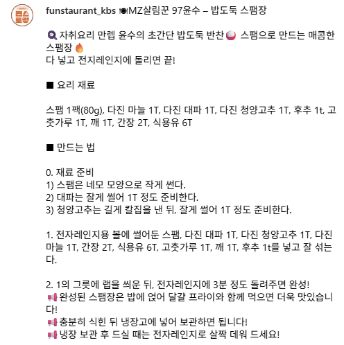 전자레인지로 3분 끝! 편스토랑 MZ살림꾼 윤수의 초간단 반찬, 밥도둑 스팸장 레시피입니다. 자취요리, 간단반찬 찾는 분께 추천합니다.