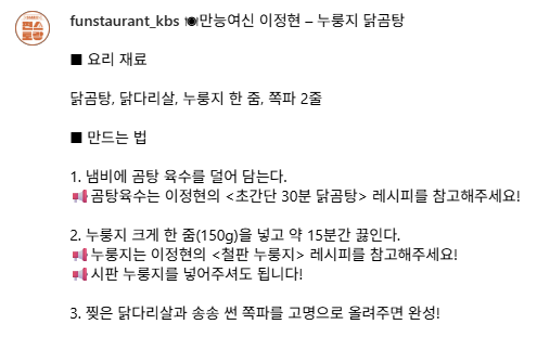 | 편스토랑 – 이정현 초간단 30분 닭곰탕 레시피 (0) | 2025.11.01 |