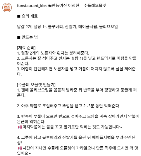 편스토랑 이정현의 부드럽고 폭신한 수플레오믈렛 레시피! 달걀 머랭으로 만드는 홈카페 스타일 오믈렛, 블루베리와 산딸기로 맛과 비주얼을 한층 업그레이드합니다.
