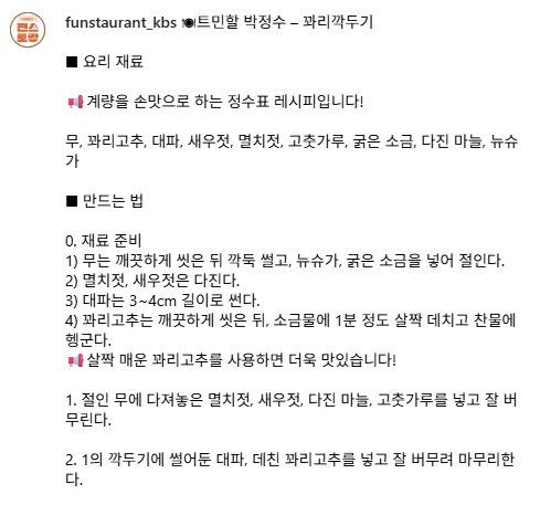 편스토랑 박정수의 꽈리깍두기 레시피입니다. 꽈리고추와 무의 아삭한 식감이 어우러진 새콤매콤한 밥도둑 반찬으로, 손맛 가득한 정수표 레시피를 따라 쉽게 만들어보세요.