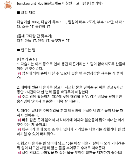 찬또셰프 이찬원의 ‘고디탕(다슬기탕)’ 레시피를 정리했습니다.