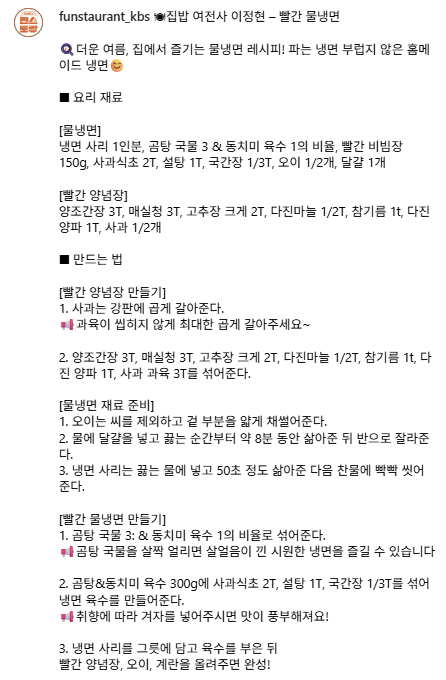 집밥 여전사 이정현의 빨간 물냉면 레시피 공개! 곰탕 국물과 동치미 육수를 활용한 시원하고 깊은 맛의 냉면, 여름철 집에서도 간편하게 즐길 수 있는 홈메이드 물냉면 만드는 법을 자세히 소개합니다🍜