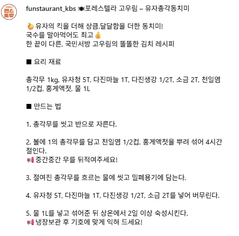 유자청으로 상큼함을 더한 포레스텔라 고우림의 유자총각동치미 레시피 정리. 모바일 가독성, 네이버 검색 최적화 버전으로 쉽게 따라 만드는 깔끔한 동치미 비법을 소개합니다.