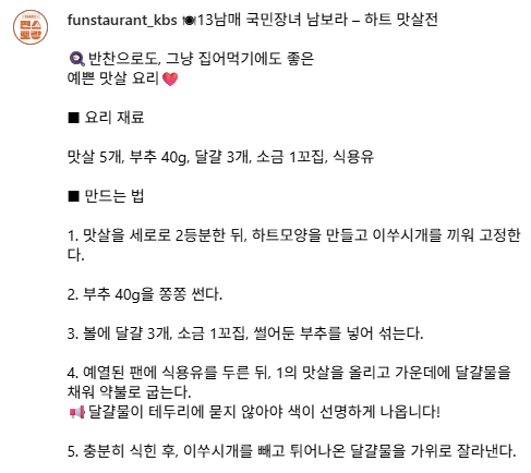 편스토랑 남보라가 소개한 하트 맛살전 레시피를 정리했습니다. 간단한 재료로 만드는 예쁜 반찬으로, 도시락·집들이 메뉴로도 추천드립니다.