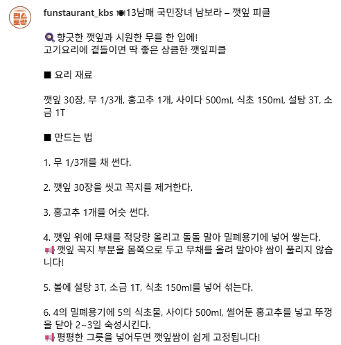 향긋한 깻잎과 아삭한 무를 돌돌 말아 담는 편스토랑 깻잎 피클 레시피입니다. 고기요리에 곁들이기 좋은 상큼한 피클 만드는 법을 간단하게 정리했습니다.