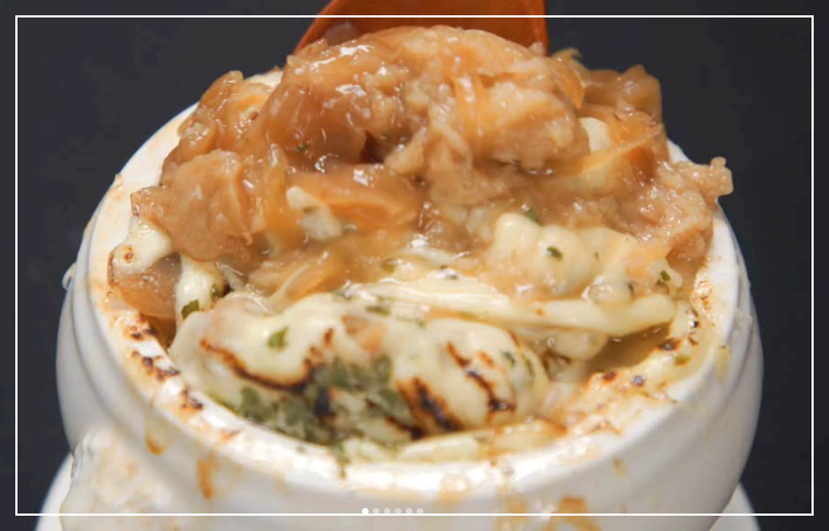 - 그릇 바닥에 바게트 빵을 깔고 수프를 부어줍니다.