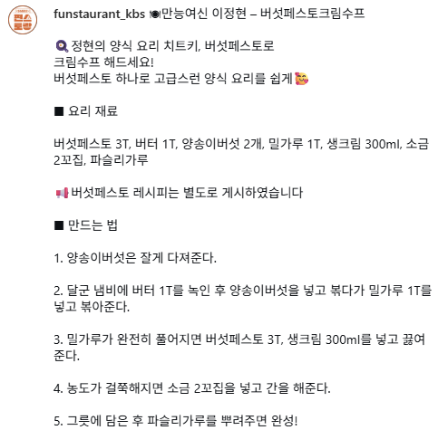 | 편스토랑 만능여신 이정현 버섯페스토 레시피 (0) | 2025.12.11 |