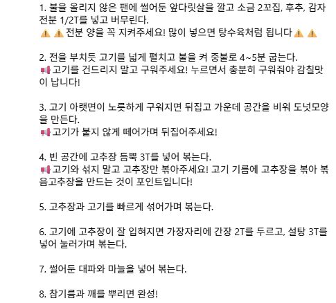 👉 재울 필요 없이 바로 조리 가능하니 바쁜 직장인, 자취생에게도 딱 맞는 레시피입니다.
