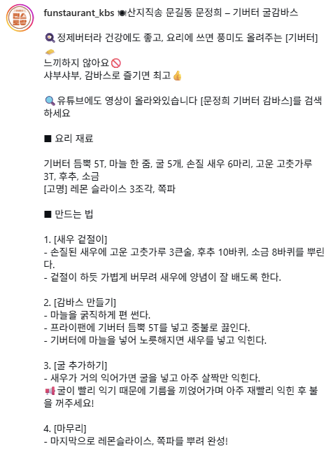 편스토랑 문정희 기버터 굴감바스 레시피를 정리했습니다. 정제버터 기버터로 느끼함 없이 즐기는 감바스, 굴과 새우를 활용한 집에서 쉽게 만드는 편스토랑 공식 레시피입니다.