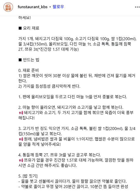 통들깨가지밥은 기름기 과하지 않으면서도 고소한 들깨 풍미 덕분에 한 그릇만으로도 충분히 만족스러운 밥요리입니다. 실제로 편스토랑에서 문정희 셰프가 소개한 레시피로, 반찬이 필요 없는 집밥 메뉴로 활용하기 좋습니다.